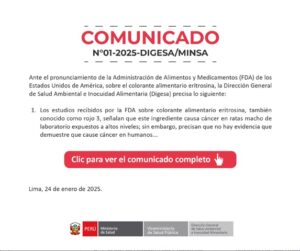 𝐃𝐈𝐆𝐄𝐒𝐀 Perú se pronuncia sobre la prohibición de la FDA el colorante 𝐑𝐨𝐣𝐨 𝐍𝐨. 𝟑 (Eritrosina), indicó que en el país no se registran alimentos